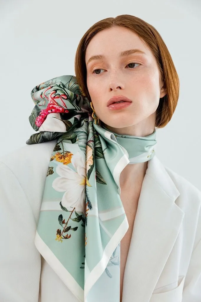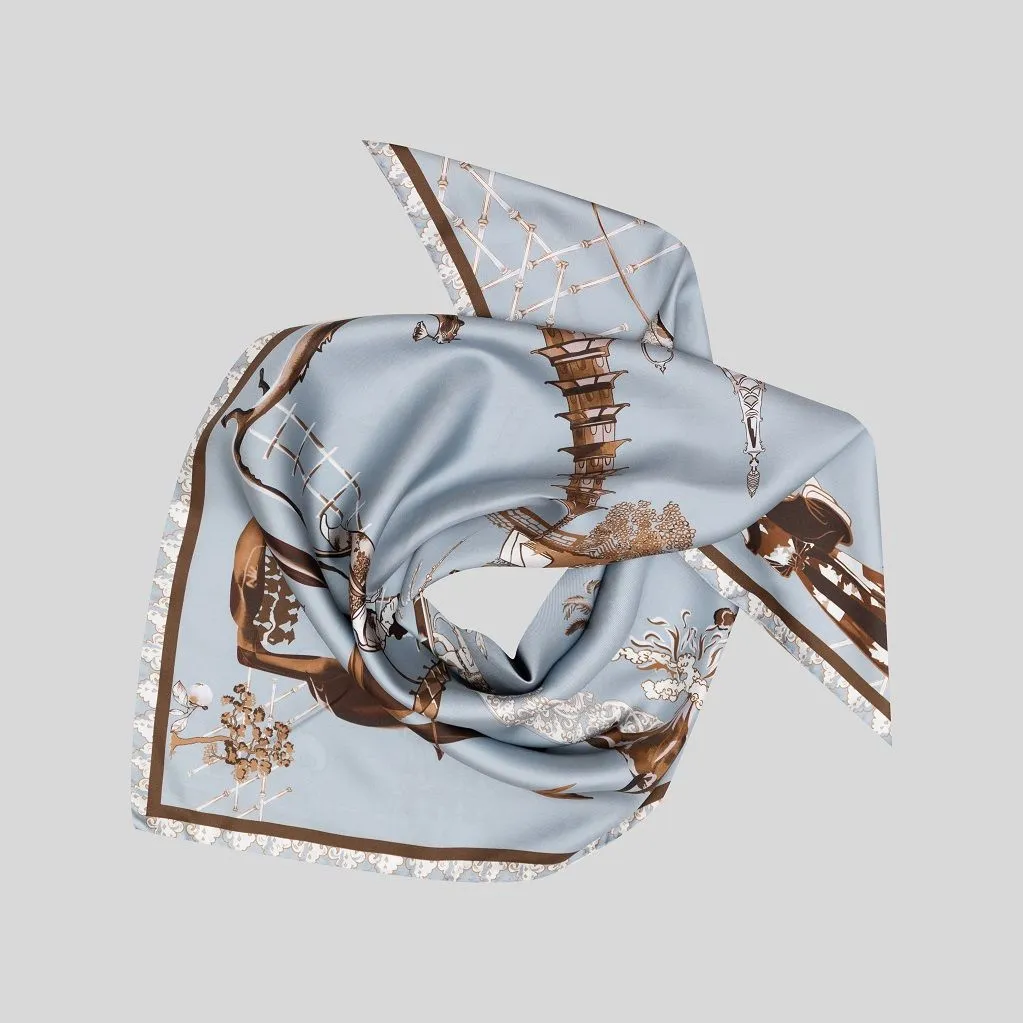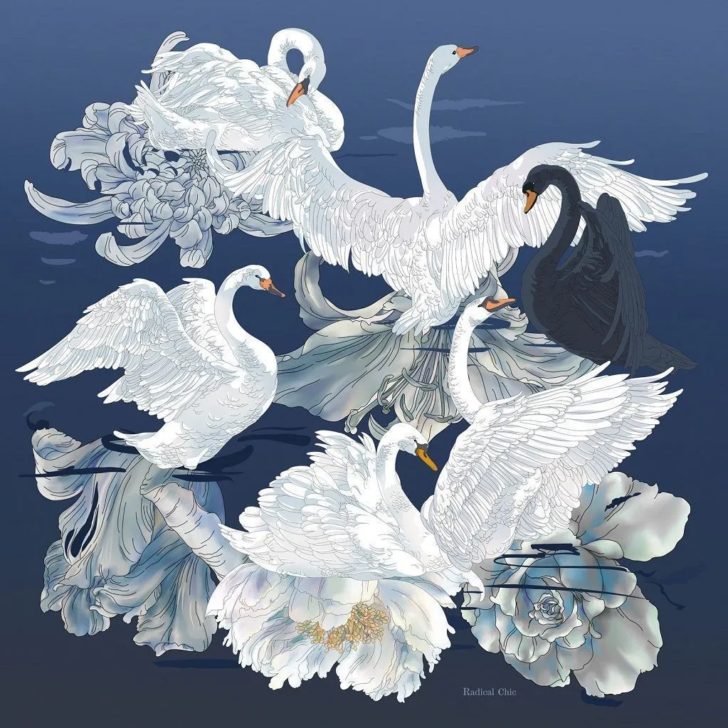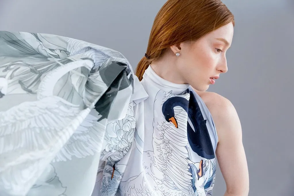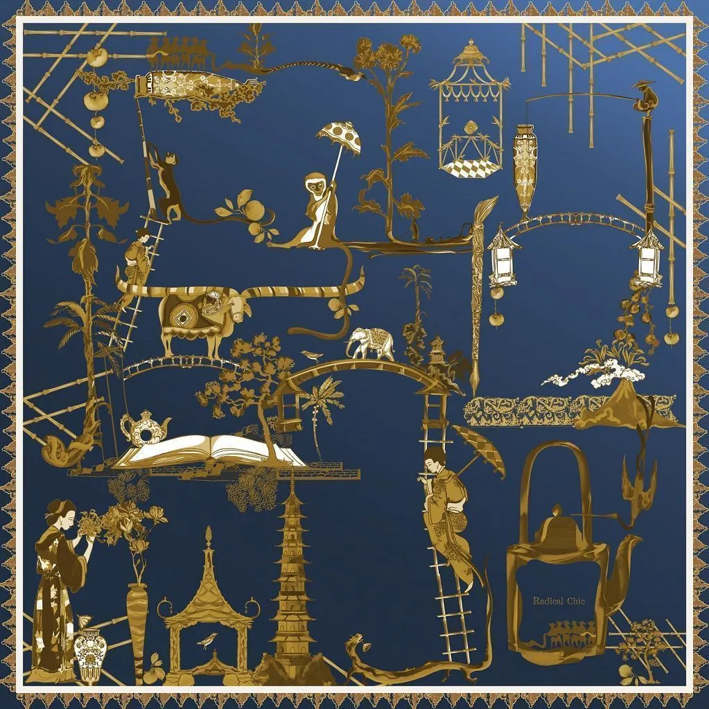 Nel disegno della sciarpa “Dao”, gli artisti riflettono con arguzia e filosofia sulle vicissitudini del destino. La scimmia distrasse la bella, le lasciò cadere l'ombrello ed è per questo che quest'anno i crisantemi fiorirono prima del solito. Il design di "Liberta" è una storia di perfezione e illusione, in cui il cigno nero simboleggia l'imprevedibilità della vita.